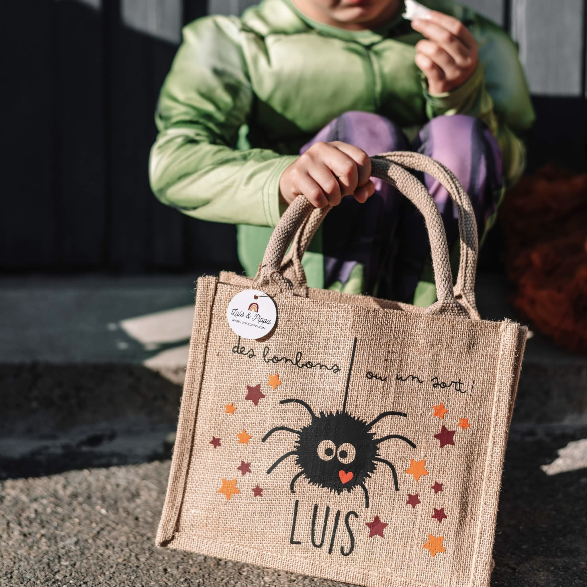 Halloween c’est tellement chouette pour les enfants de se déguiser ! Voici de quoi aller récolter les bonbons: Mini cabas personnalisé pour un Halloween stylé ! Dimension: +-26cm de longueur et 22cm de largeur.